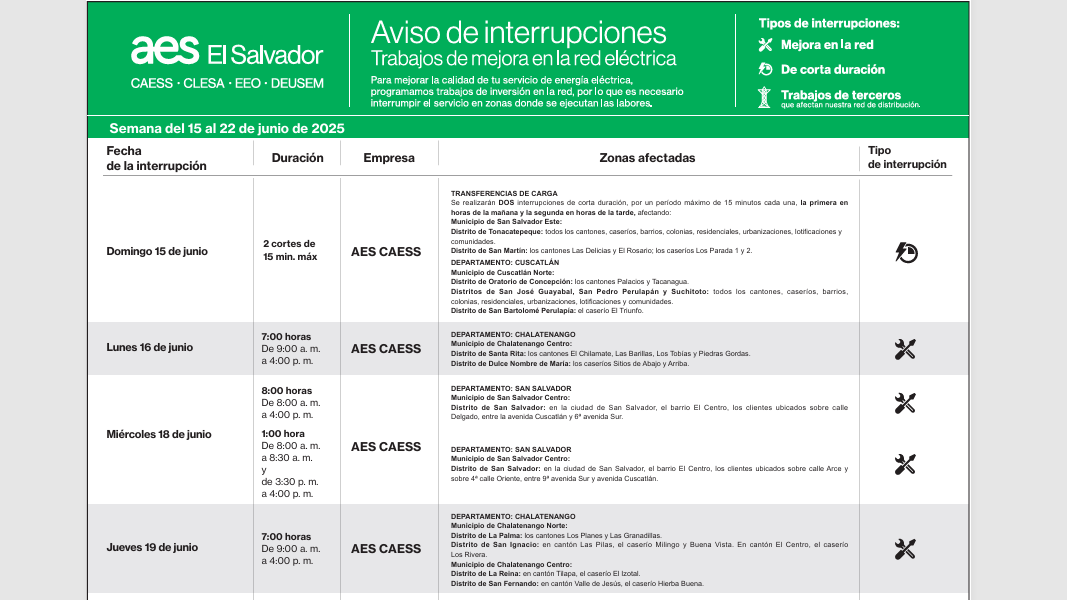 La empresa distribuidora de energía eléctrica AES CLESA ha notificado a los usuarios del occidente del país sobre interrupciones programadas del servicio eléctrico en los municipios de Tacuba (Ahuachapán) y Metapán (Santa Ana), como parte de labores de mantenimiento preventivo en su red de distribución.