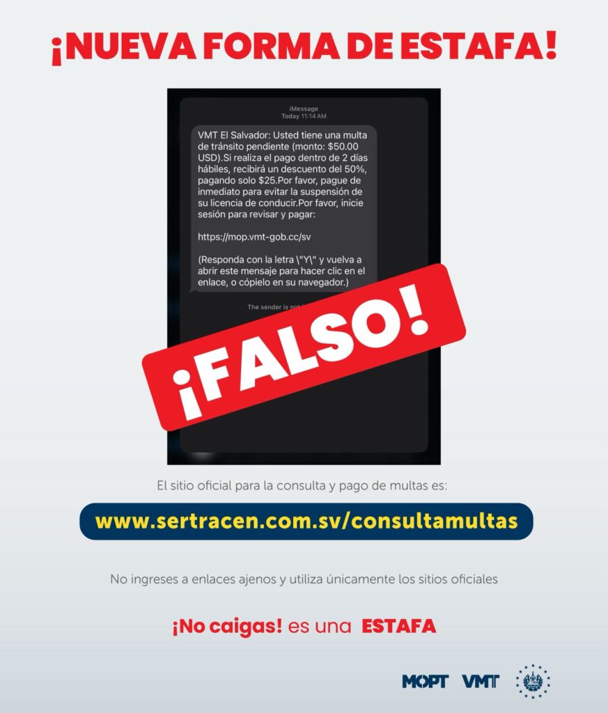 “Hacemos un llamado a la ciudadanía a mantenerse alerta y a no compartir información personal en enlaces sospechosos. Toda consulta de multas debe hacerse únicamente a través del sitio oficial de SERTRACEN”, advierte una publicación en redes sociales del Viceministerio de Transporte (VMT).