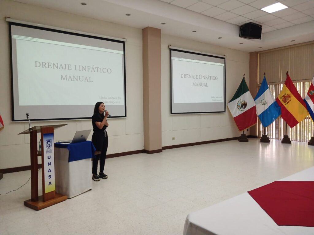 Estudiantes de segundo año de la Licenciatura en Fisioterapia de la Universidad Autónoma de Santa Ana (UNASA) participaron en un taller teórico-práctico sobre la técnica de drenaje linfático manual, con el objetivo de potenciar sus competencias clínicas en el manejo de edemas y procesos inflamatorios. La capacitación se desarrolló en el Auditorio Sergio Amílcar Carranza, en el marco de la asignatura Medios Físicos en Rehabilitación, impartida por las docentes Máster Isabel Alejandra Flores de Quintanilla y Máster Iliana Guadalupe Peñate.
