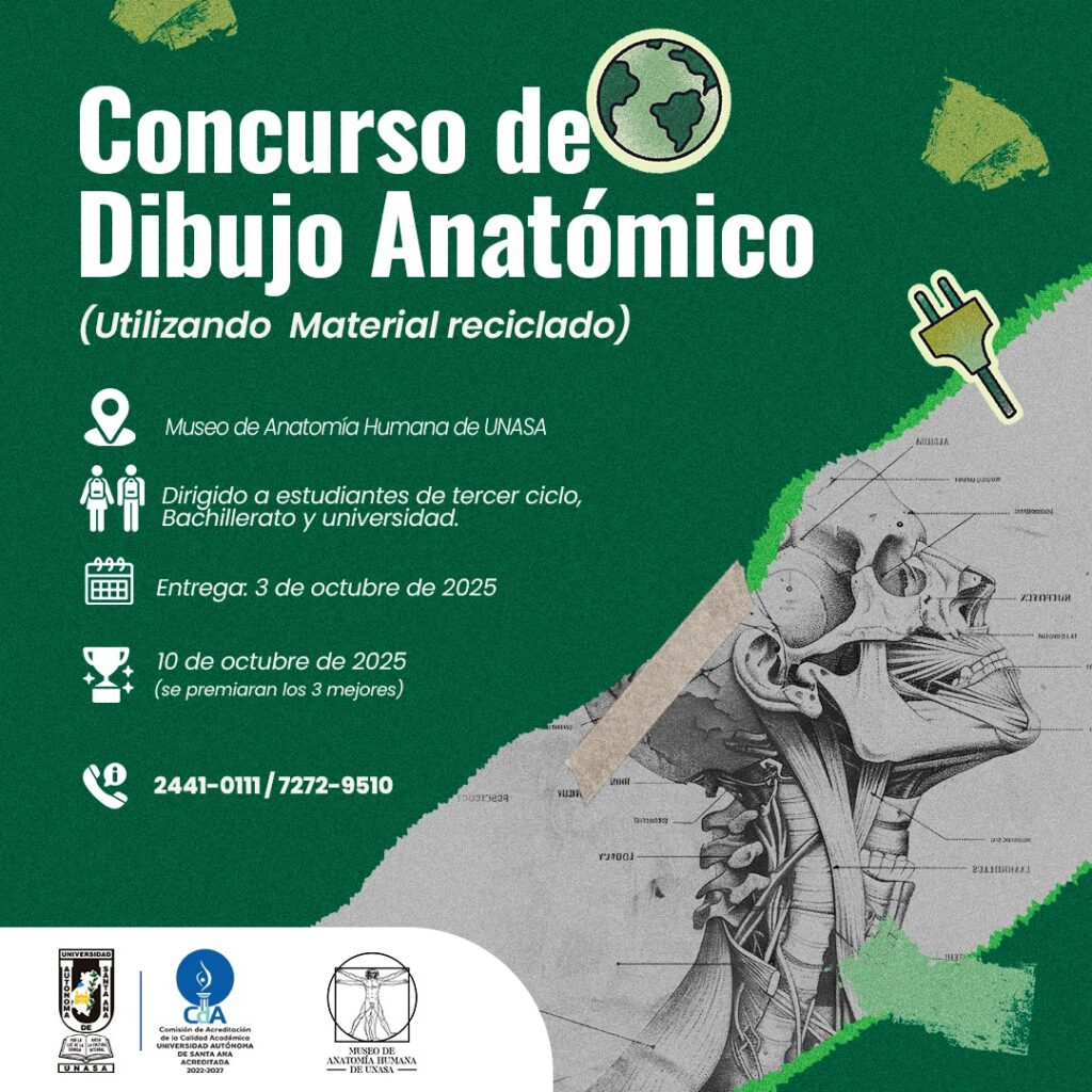 El Museo de Anatomía Humana de la Universidad Autónoma de Santa Ana (UNASA) lanzó la convocatoria para el concurso de dibujo anatómico, dirigido a estudiantes de tercer ciclo, bachillerato y universidad, con el objetivo de promover el aprendizaje de la anatomía humana a través del arte. La fecha límite de entrega es el 3 de octubre, y la premiación se realizará el 10 de octubre a las 9:00 a.m., reconociendo los tres primeros lugares por categoría.