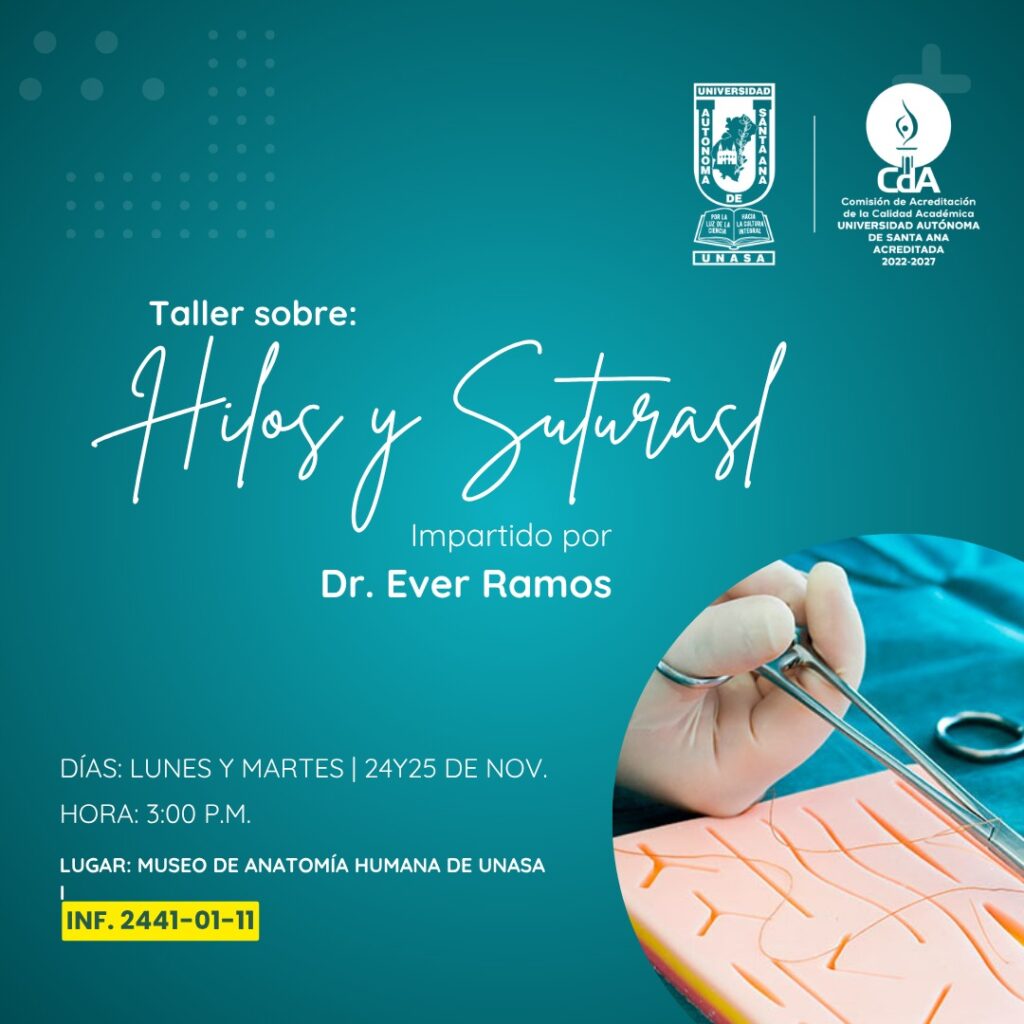 Posteriormente, el 24 y 25 de noviembre a las 3:00 p.m., se desarrollará el Taller de Hilos y Suturas, impartido por el Dr. Ever Ramos, enfocado en técnicas básicas de cierre de heridas, un conocimiento esencial en el ámbito clínico.