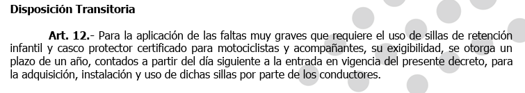 Artículos transitorios: plazo para cascos certificados y sillas de retención infantil
