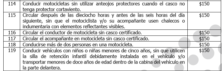Entre las disposiciones más relevantes se encuentran aquellas relacionadas con la obligatoriedad del uso de cascos certificados para motociclistas y el uso de sillas de retención infantil para menores de cinco años, consideradas faltas muy graves dentro del nuevo régimen sancionatorio.